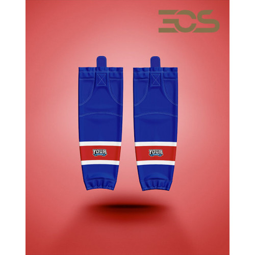 Design and customize your own hockey socks in your team colors and with your own logos. Sublimated with free design. With velcro at the top and strecth at the bottom.