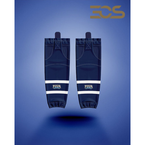 Design and customize your own hockey socks in your team colors and with your own logos. Sublimated with free design. With velcro at the top and strecth at the bottom.