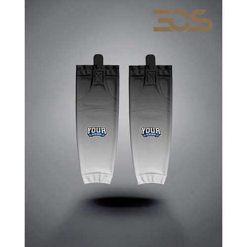 Design and customize your own hockey socks in your team colors and with your own logos. Sublimated base with sewn stripes. With velcro at the top and strecth at the bottom.
