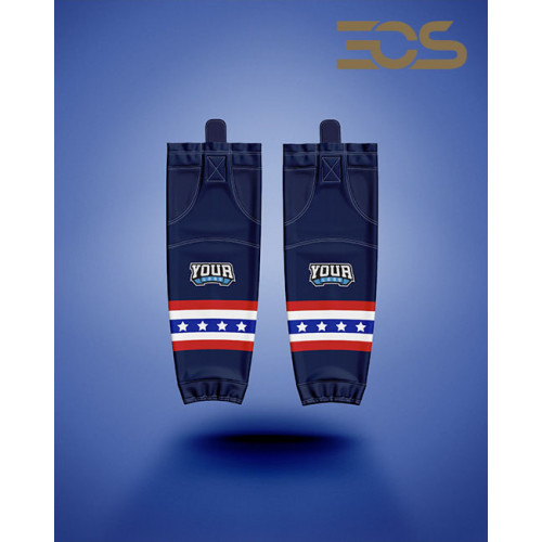Design and customize your own hockey socks in your team colors and with your own logos. Sublimated base with sewn stripes. With velcro at the top and strecth at the bottom.